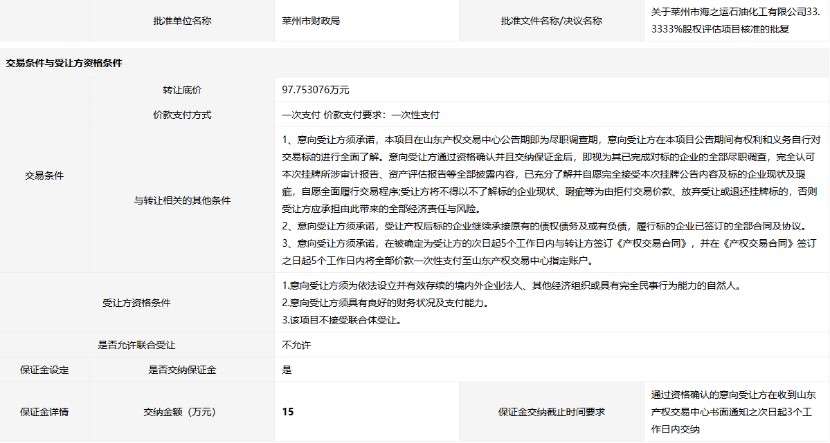 萊州市海之運(yùn)石油化工有限公司33.3333%國(guó)有股權(quán)