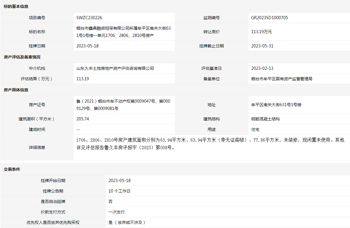 煙臺市鑫鼎融資擔保有限公司所屬牟平區(qū)南關大街631號1號樓一單元1706、2806、2810號房產(chǎn)